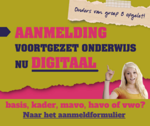 In de centrale aanmeldweek kunnen nieuwe leerlingen bij ons aangemeld worden voor basis, kader, tl/mavo, havo of vwo. Kies bij een dubbel advies van de basisschool bij ons het hoogste niveau.